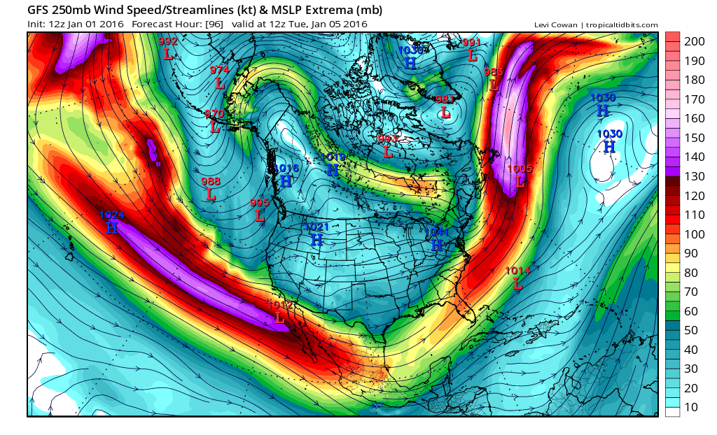 A powerful and likely El Niño-influenced subtropical jet will develop over and south of California, creating a favorable condition for significant precipitation. (NCEP via tropicaltidbits.com)